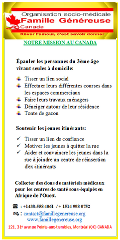 § Débuter l’implantation de l’organisation Famille Généreuse, en Afrique ; entamer la construction d’un premier centre de soin médical gratuit, en Cotte d’ivoire, pour les personnes démunies du 3e âge.